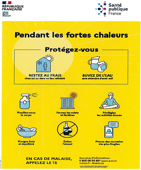 En cas d'épisode de forte chaleur, le ministère des Solidarités et de la Santé met à disposition du public la plate-forme téléphonique « Canicule info service », accessible au 0 800 06 66 66 (appel gratuit depuis un poste fixe) de 9 heures à 19 heures afin de vous informer sur les recommandations sanitaires à suivre en période de fortes chaleurs.